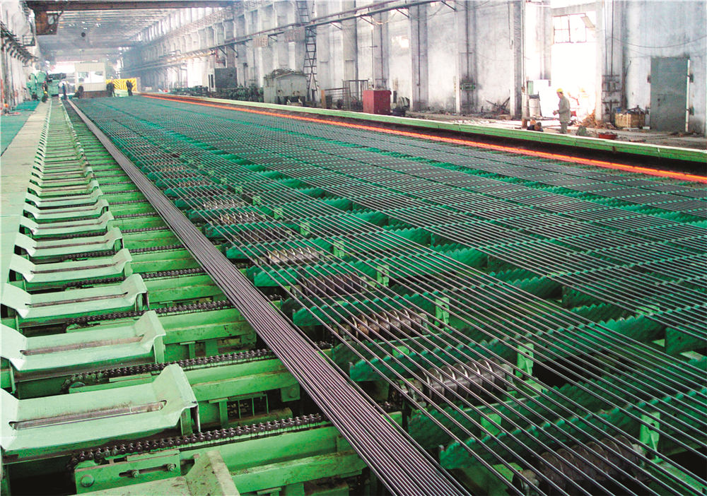 全連續(xù)棒材生產(chǎn)線采用煤氣蓄熱式加熱爐,全線18架軋機(jī)平立交替布置,鋼坯通過(guò)達(dá)涅利無(wú)頭焊接設(shè)備實(shí)現(xiàn)無(wú)頭軋制。工序?qū)崿F(xiàn)了自動(dòng)計(jì)數(shù)、自動(dòng)打包、機(jī)器人自動(dòng)焊牌等智能化流程。電控系統(tǒng)采用德國(guó)西門子6RA70全數(shù)字直流傳動(dòng)裝置和美國(guó)GE9070可編程序控制器,倍尺飛剪及控制系統(tǒng)采用意大利設(shè)備,該條生產(chǎn)線屬國(guó)際先進(jìn)水平。產(chǎn)品規(guī)格:?12mm~?40mm,主要生產(chǎn)碳素鋼及建筑鋼等產(chǎn)品。